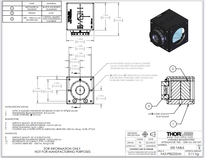 Thorlabs索雷博 VA5-PBS253/M - 可变分束镜